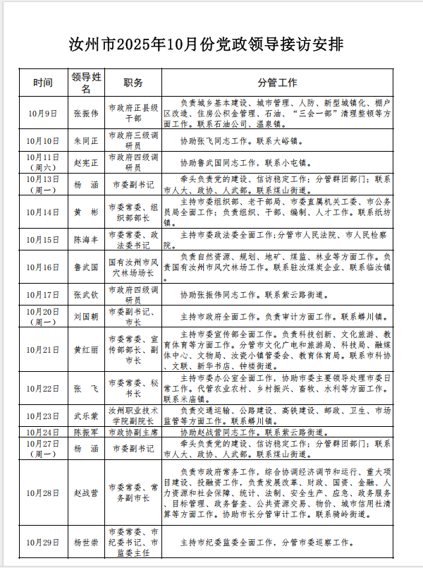 汝州市2025年10月份党政领导接访表