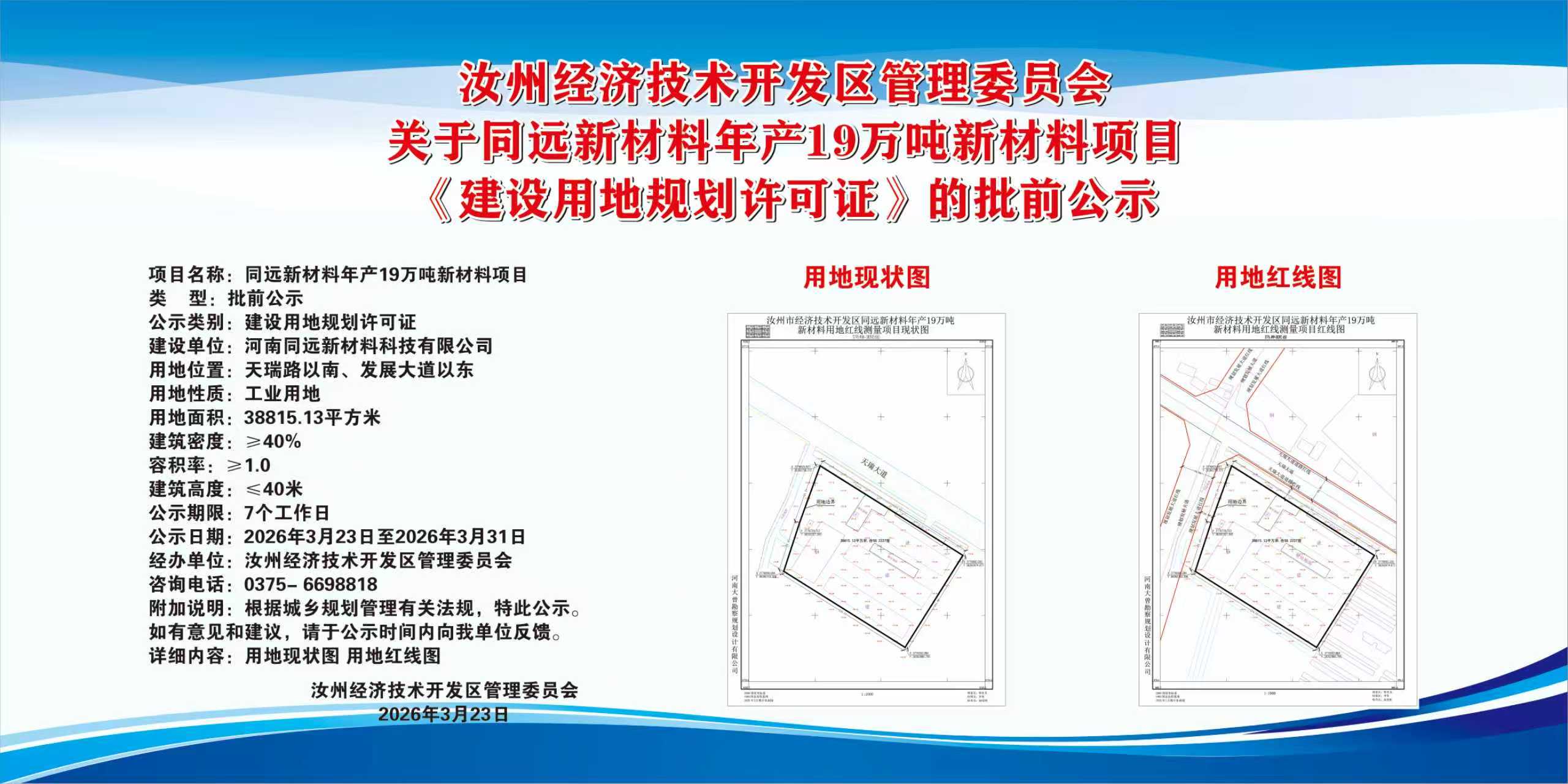 汝州经济技术开发区管理委员会关于同远新材料年产19万吨新材料项目《建设用地规划许可证》的批前公示