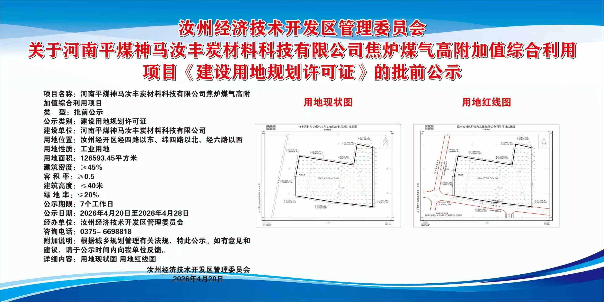 汝州经济技术开发区管理委员会 关于河南平煤神马汝丰炭材料科技有限公司焦炉煤气高附加值综合利用项目《建设用地规划许可证》的批前公示